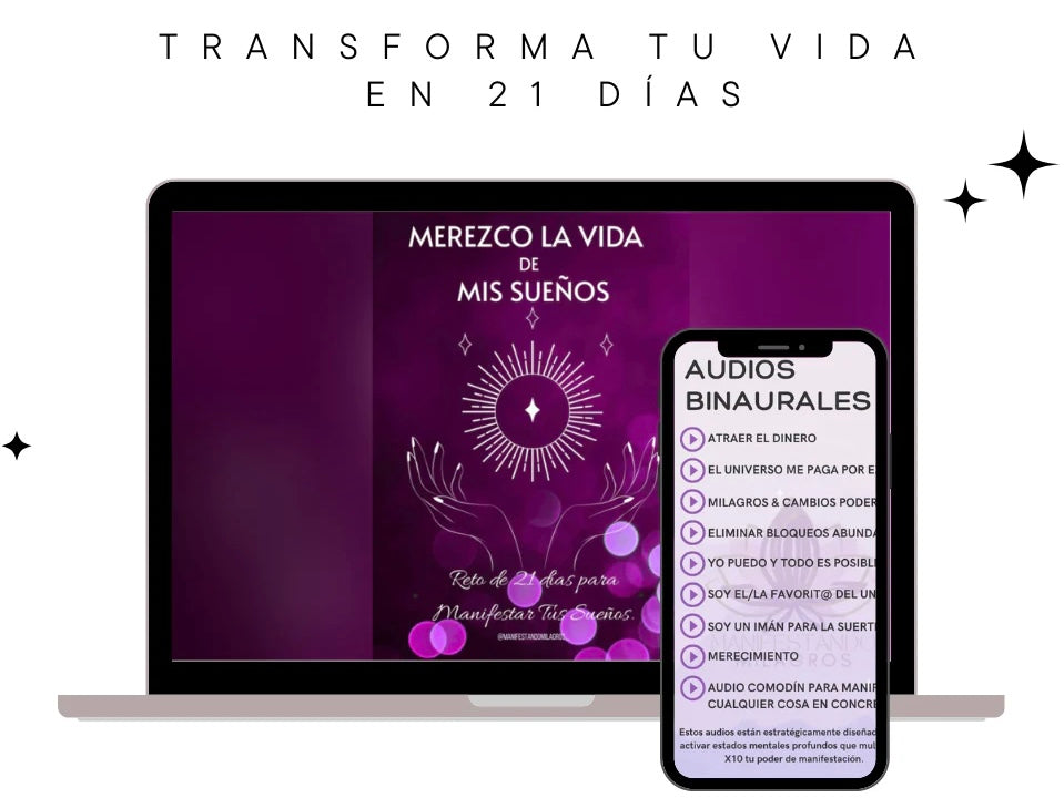 La guía VIP INCLUYE 10 AUDIOS BINAURALES 🎧 de regalo, para que aceleres y facilites tu proceso de manifestación. Cada frecuencia actúa directamente sobre tu subconsciente, rompiendo bloqueos y alineando tu vibración con lo que deseas, lo cual hace que manifiestes de forma más rápida y efectiva.